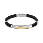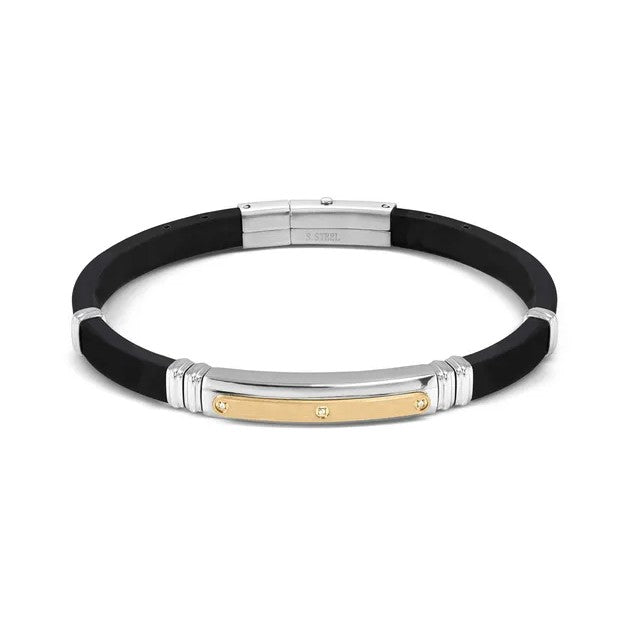 Black rubber adjustable length bracelet with stainless steel details and sliding button clasp. Featuring brushed and polished steel sections with cubic zirconia and gold  PVD detail.