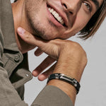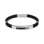 Black rubber adjustable length bracelet with stainless steel details and sliding button clasp. Featuring brushed and polished steel sections and black PVD detail.