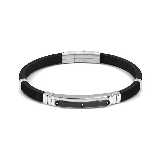 Black rubber adjustable length bracelet with stainless steel details and sliding button clasp. Featuring brushed and polished steel sections with cubic zirconia and black PVD detail.