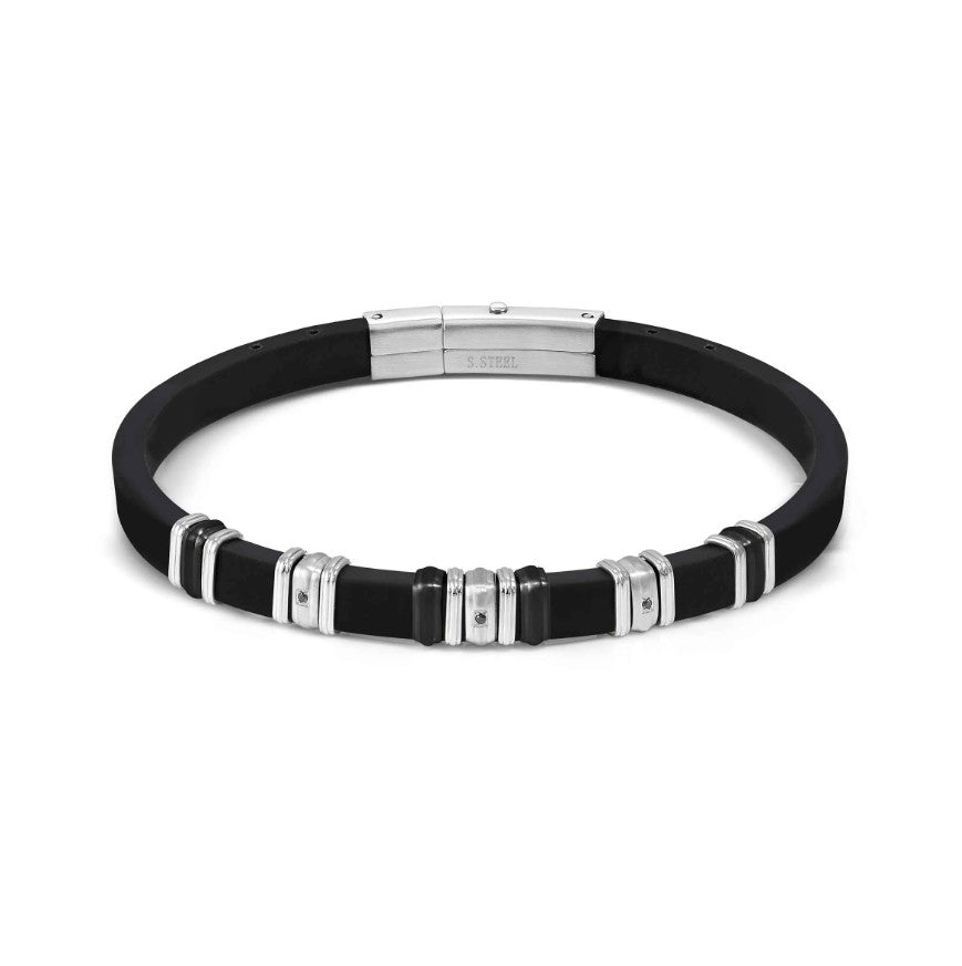 Black rubber adjustable length bracelet with stainless steel details and sliding button clasp. Featuring brushed and polished steel sections with cubic zirconia and black PVD detail.