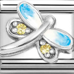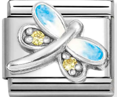 Composable Classic size charm in stainless steel with sterling silver yellow cubic zirconia blue enamel Dragonfly symbol.