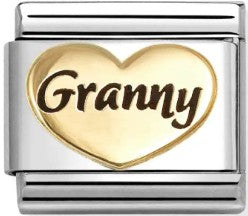 Composable Classic size charm in stainless steel with 18ct yellow gold black enamel Heart symbol with Granny message.
