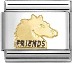 Composable Classic size charm in stainless steel with 18ct yellow gold black enamel Horse symbol with Friends message.