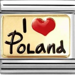 Composable Classic size charm in stainless steel with 18ct yellow gold black & red enamel I Love Poland message.