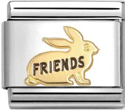 Composable Classic size charm in stainless steel with 18ct yellow gold black enamel Rabbit symbol with Friends message.
