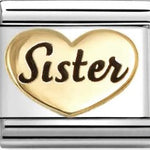 Composable Classic size charm in stainless steel with 18ct yellow gold black enamel Heart symbol with Sister message.