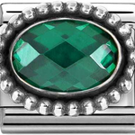 Composable Classic size charm in stainless steel with sterling silver oxidised detail beaded Oval Shape Emerald Green Cubic Zirconia stone.