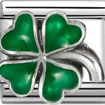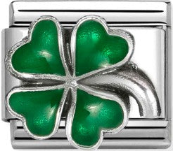 Composable Classic size charm in stainless steel with sterling silver green enamel Four Leaf Clover symbol.