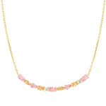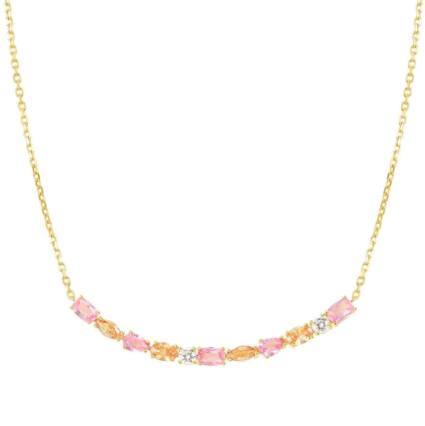Available with yellow gold galvanic plating or white rhodium treated finish, the deep colours of these brilliant stones make this necklace the perfect centerpiece for your special evenings.
