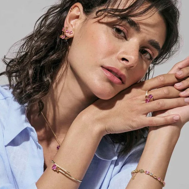 Available with yellow gold galvanic plating or white rhodium treated finish, the deep colours of these brilliant stones make this ring the perfect centerpiece for your special evenings.