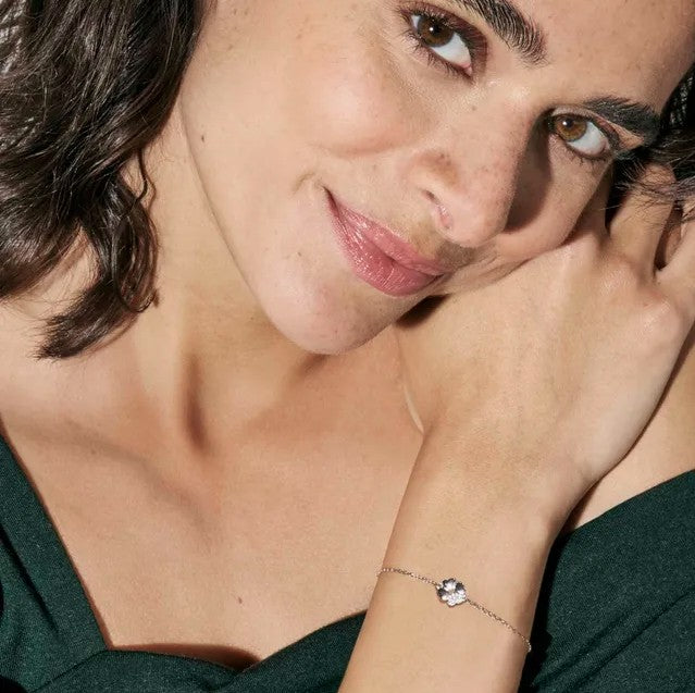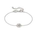 Sterling silver bracelet with Four-Leaf Clover and Cubic Zirconia, available with 18K Yellow Gold galvanic plating or White Rhodium treated finish.