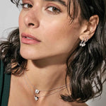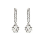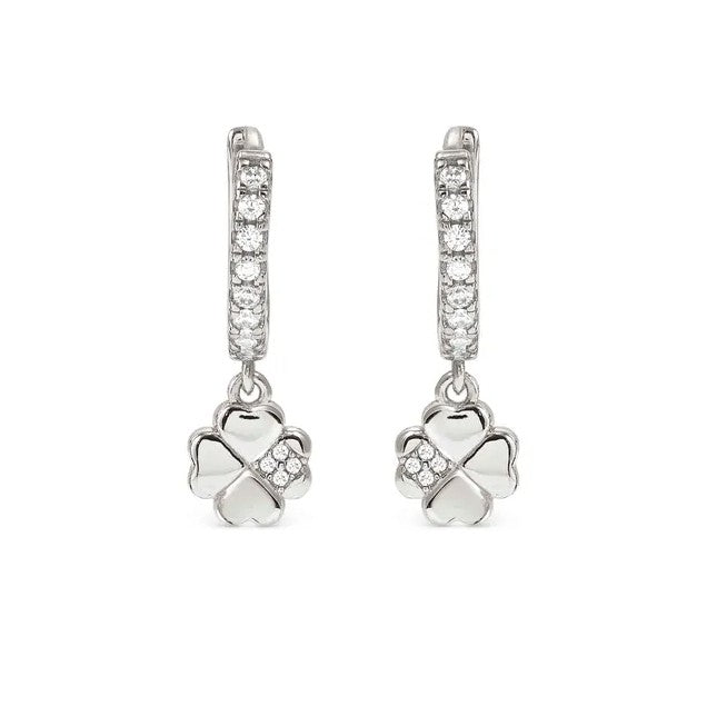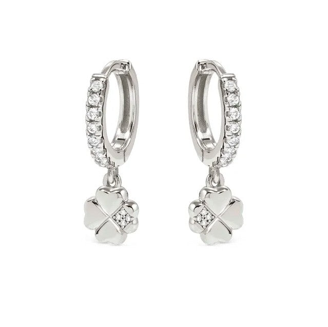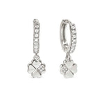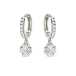 Sterling silver hoop earrings with Four-Leaf Clover pendant and Cubic Zirconia, available with 18K Yellow Gold galvanic plating or White Rhodium treated finish.