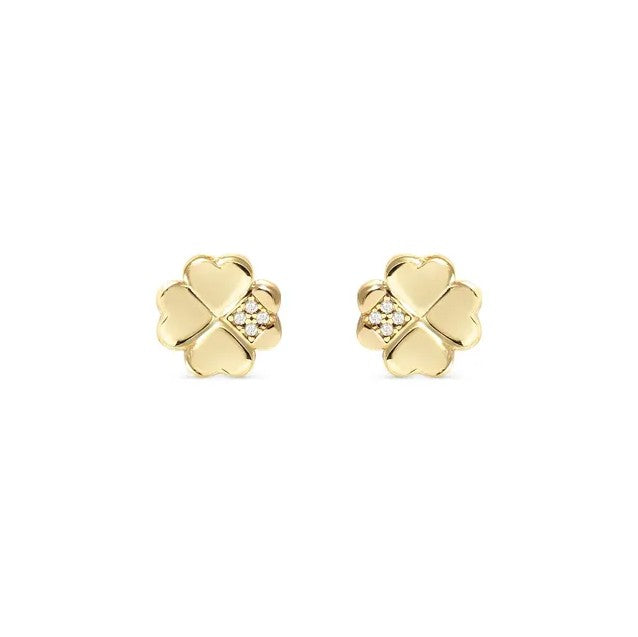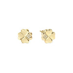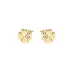 Sterling silver Four-Leaf Clover stud earrings with Cubic Zirconia, available with 18K Yellow Gold galvanic plating or White Rhodium treated finish.