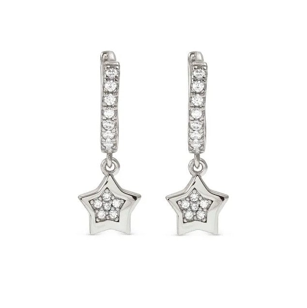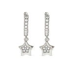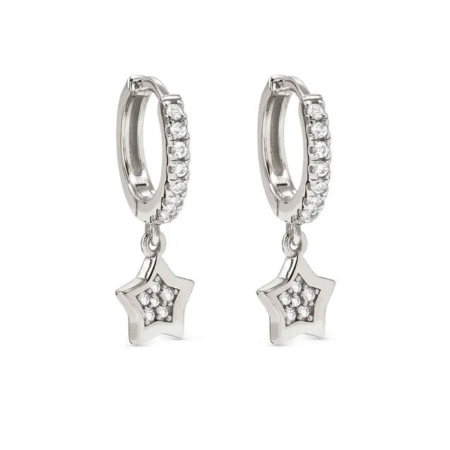 Sterling silver hoop earrings with Star pendant and Cubic Zirconia, available with 18K Yellow Gold galvanic plating or White Rhodium treated finish.