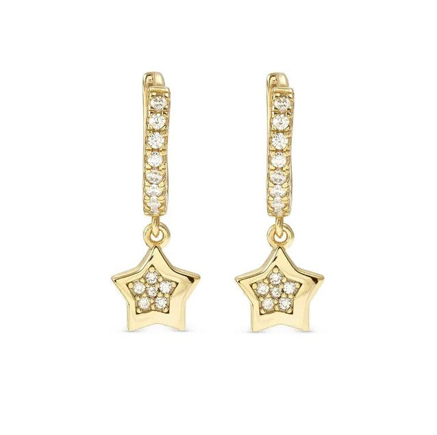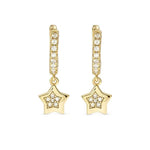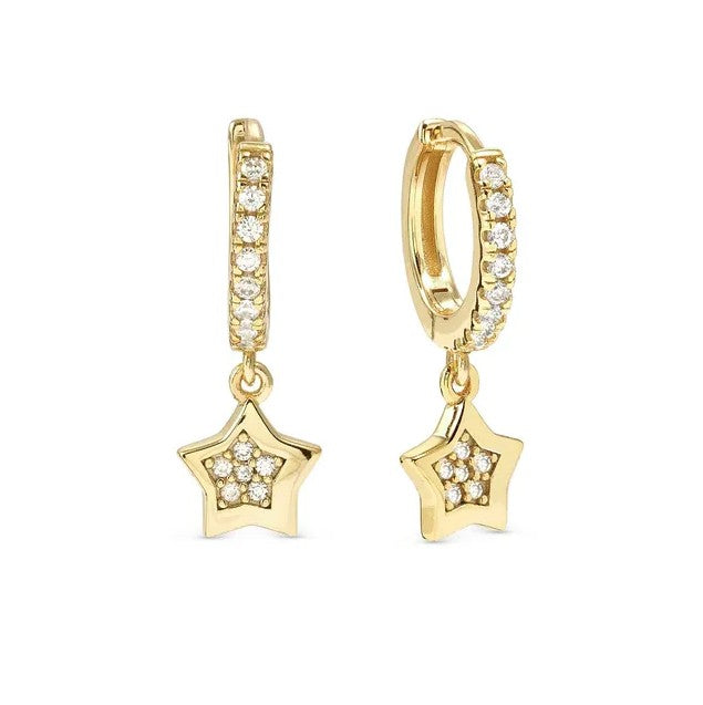 Sterling silver hoop earrings with Star pendant and Cubic Zirconia, available with 18K Yellow Gold galvanic plating or White Rhodium treated finish.