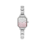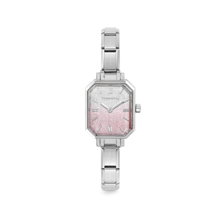 Stainless steel Composable Classic watch with rectangular case and fade glitter pink face. Features stainless steel bars with Roman Numerals.