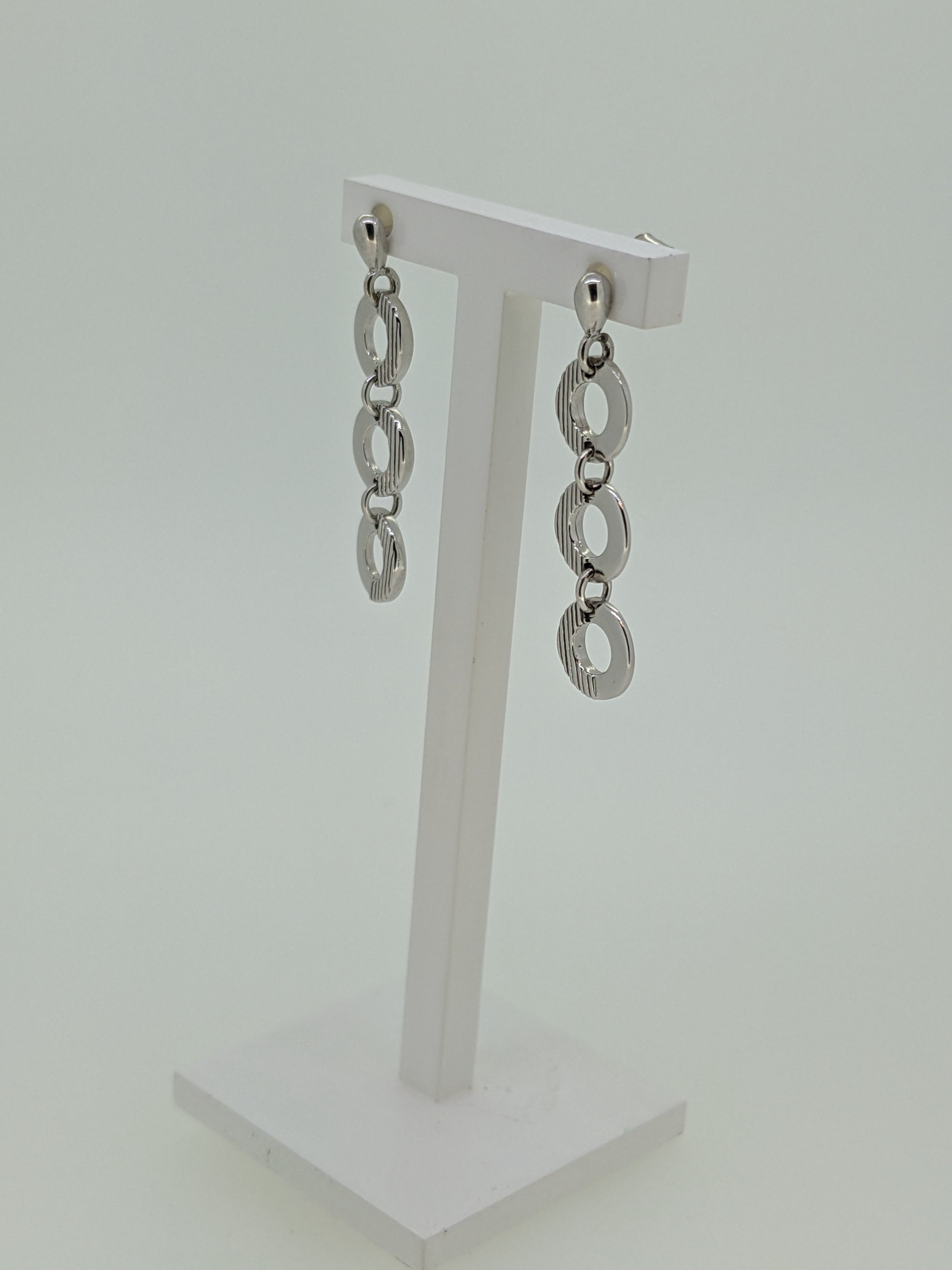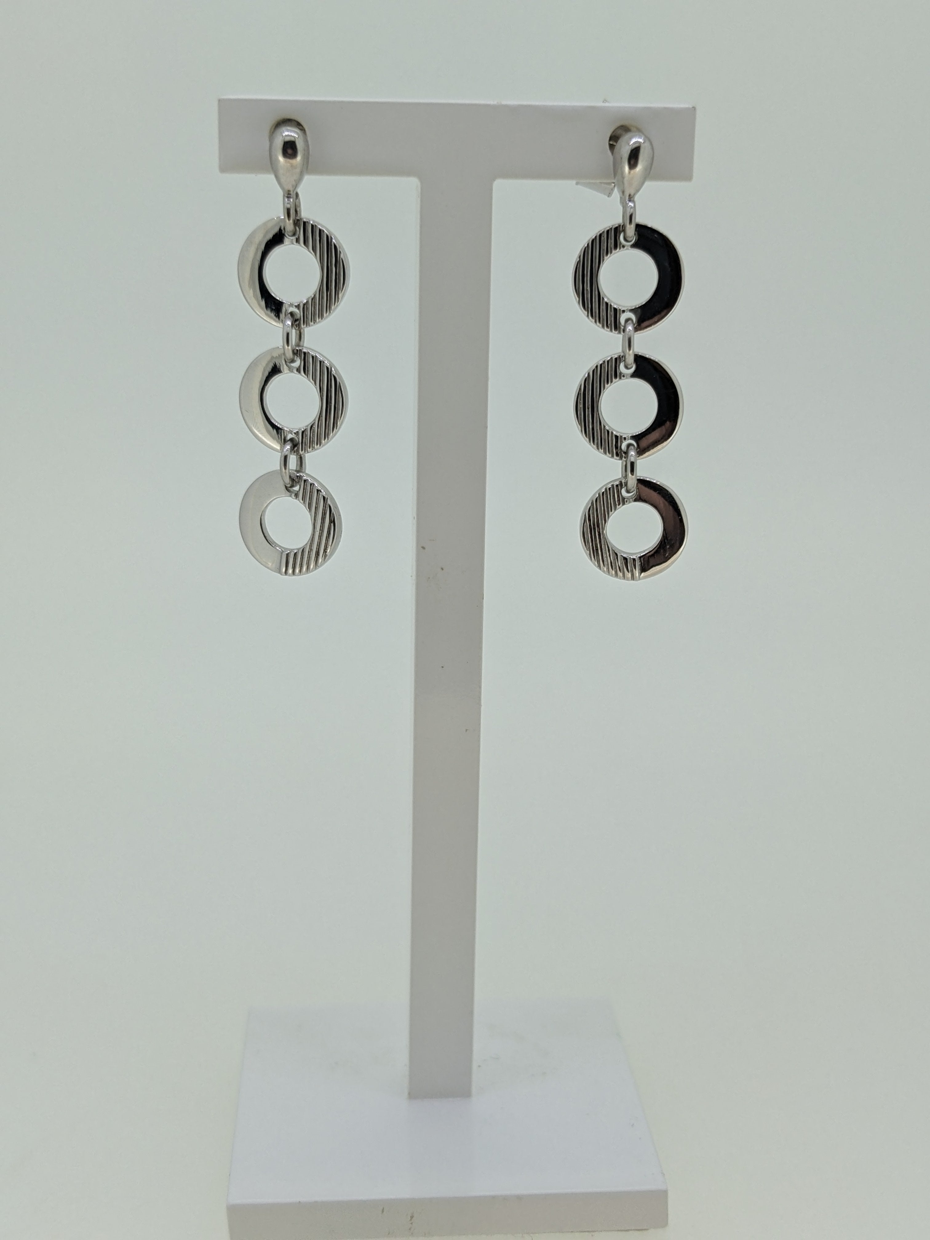 These drop earrings comprise a trio of flat circles with striated linear pattern which are articulated to create movement.