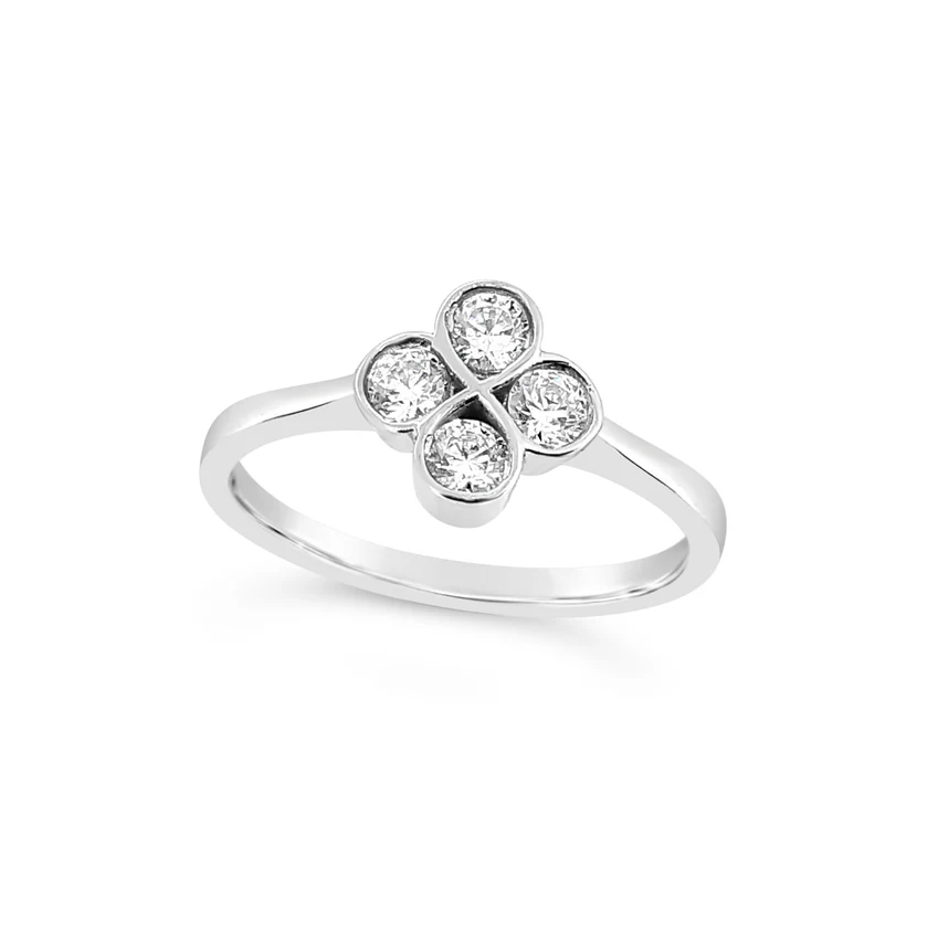 Made from platinum and four sparkling round brilliant cut diamonds, this ring is sure to bring out the fun in every occasion.