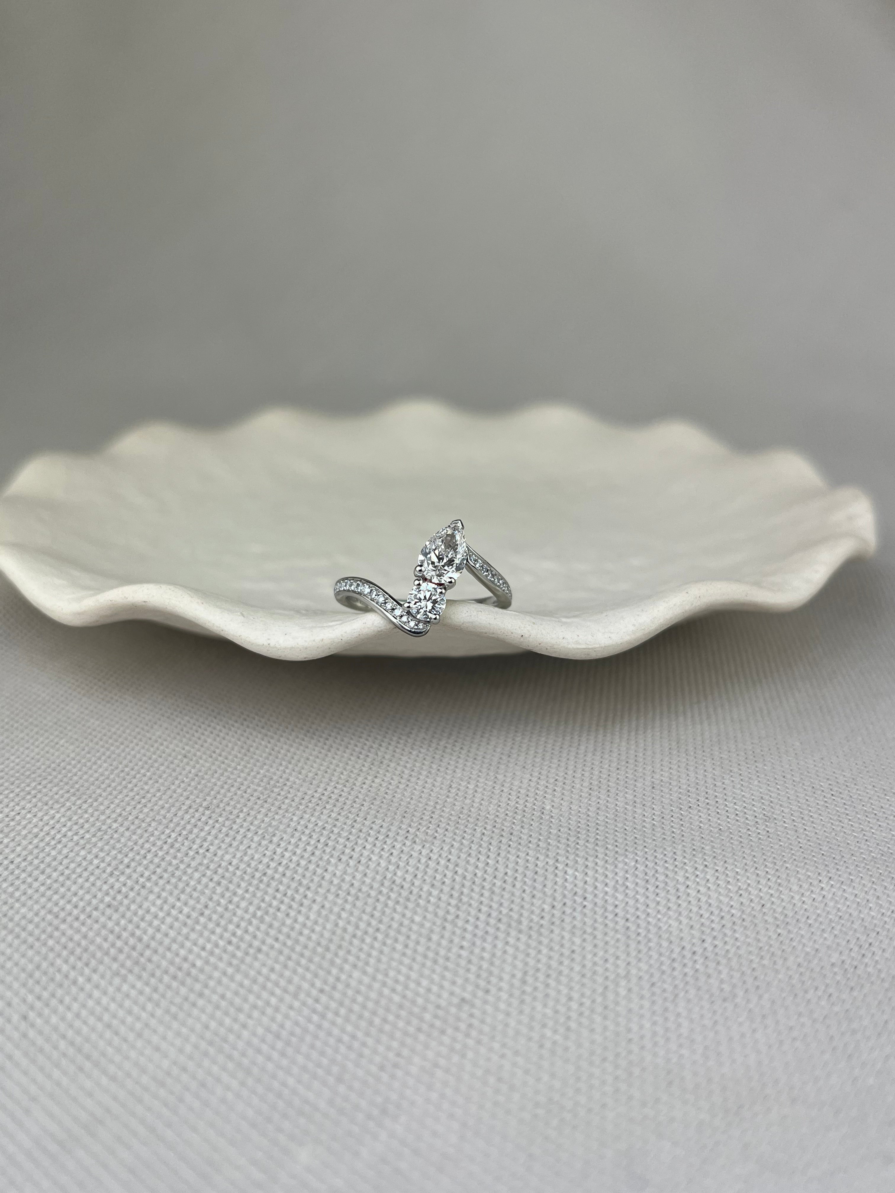 A versatile design in that the ring must feature two central elements, in this case a fabulous pear diamond and round brilliant cut diamond, which nestle together harmoniously. The shoulders are set with an additional 27 round brilliant cut diamonds for an extra touch of luxe.