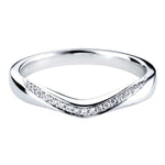This example is a shaped band with a U shape silhouette, set with a row of graduated diamonds hugging the inner edge. Available in platinum, you can also choose to have diamonds either G colour with VS clarity, or H colour with SI clarity.
