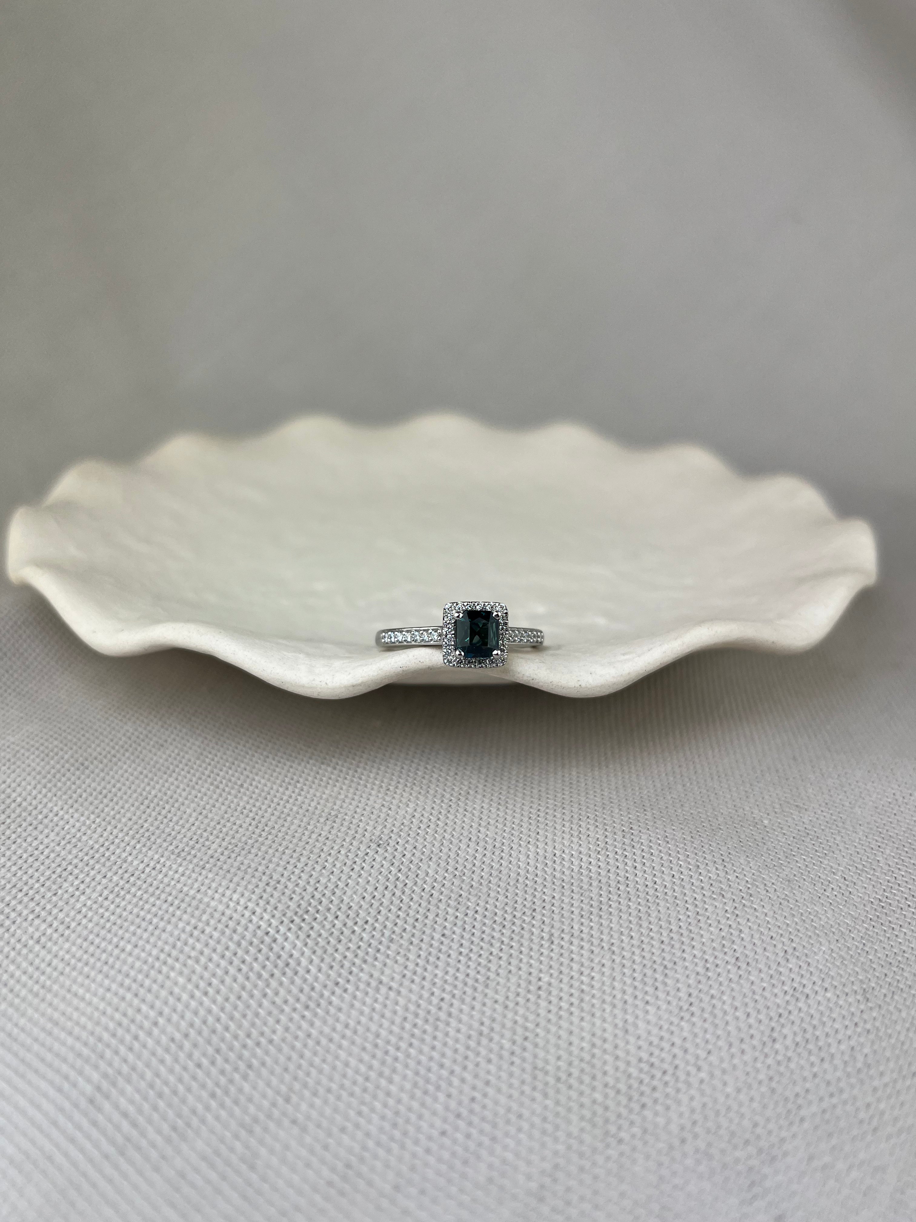 This beautiful ring is set with a single central octagonal teal sapphire, surrounded by a square halo of sparkling round brilliant cut diamonds. The ring is completed with diamond-set shoulders.