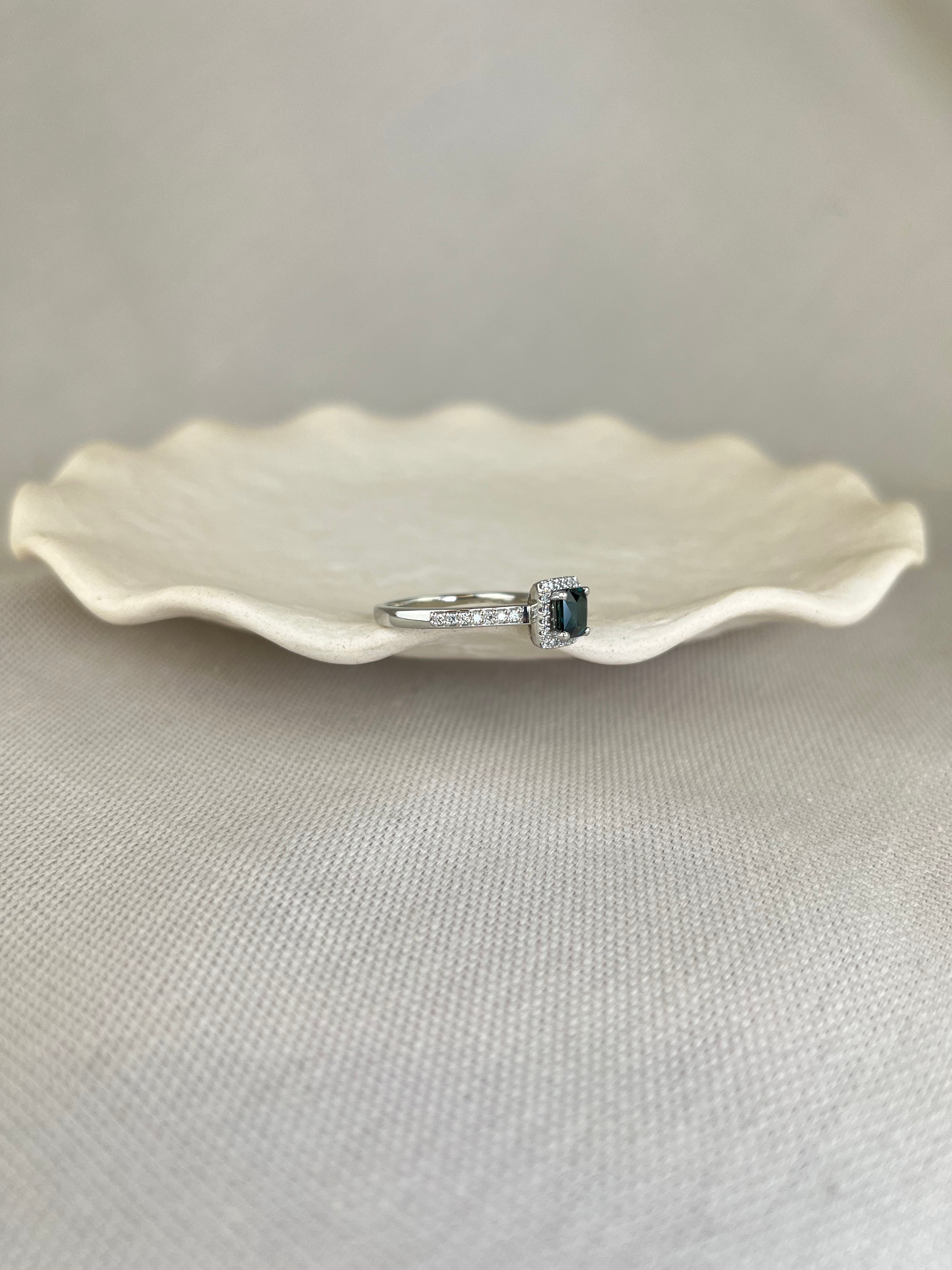 Platinum Teal Sapphire Diamond Square Halo Cluster Ring