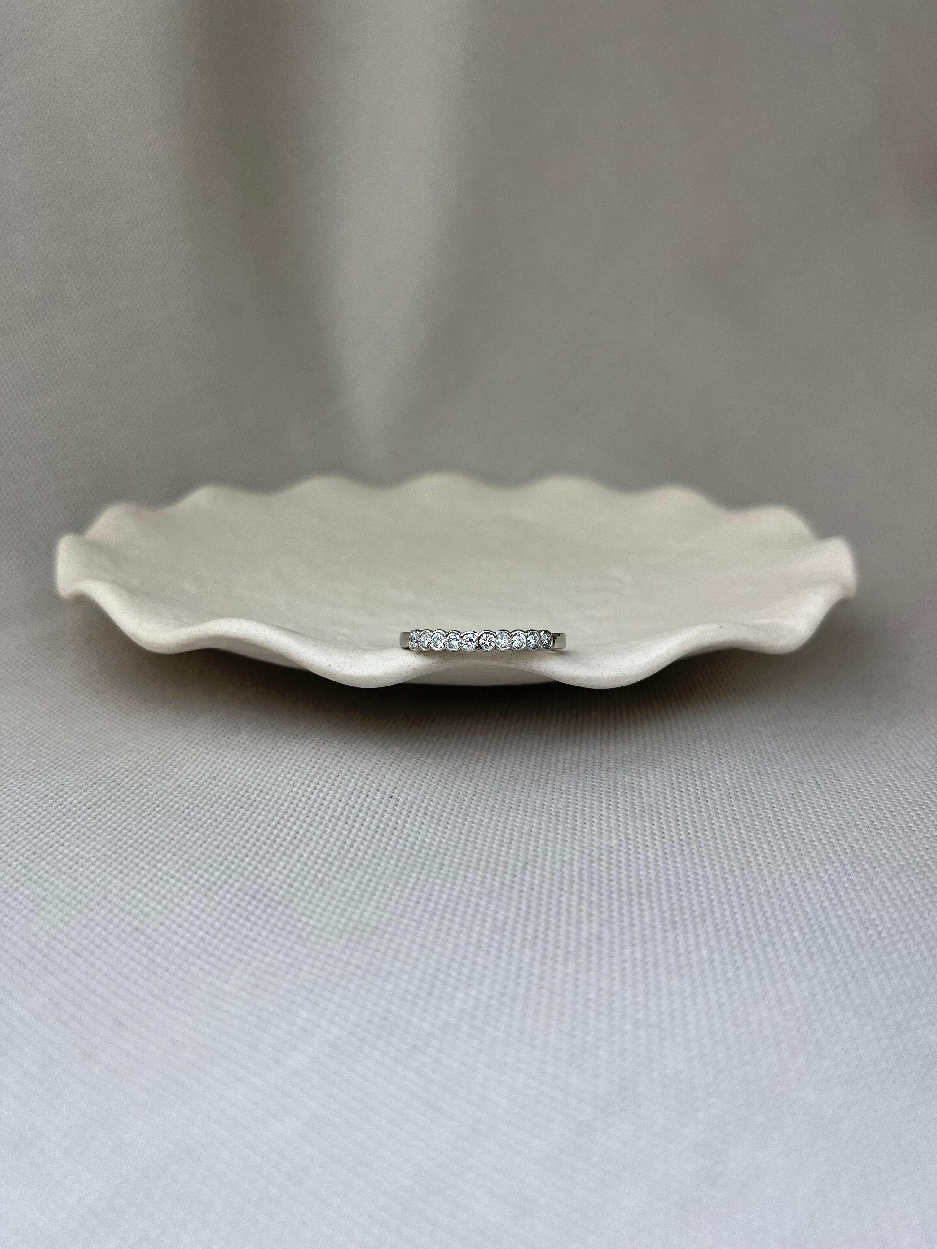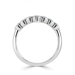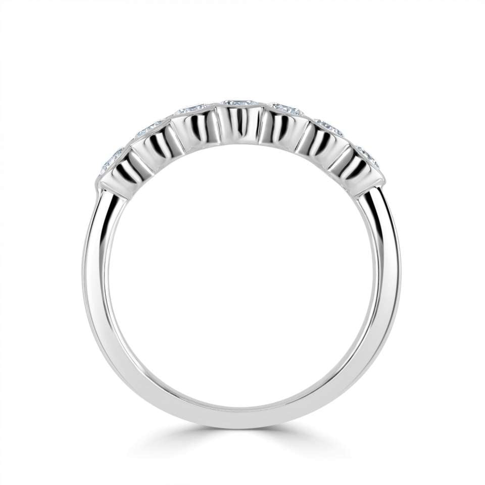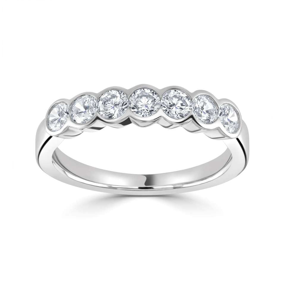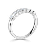 This platinum example showcases ten equally sized round brilliant cut diamonds, mounted in a seamless stream of smooth edge settings.