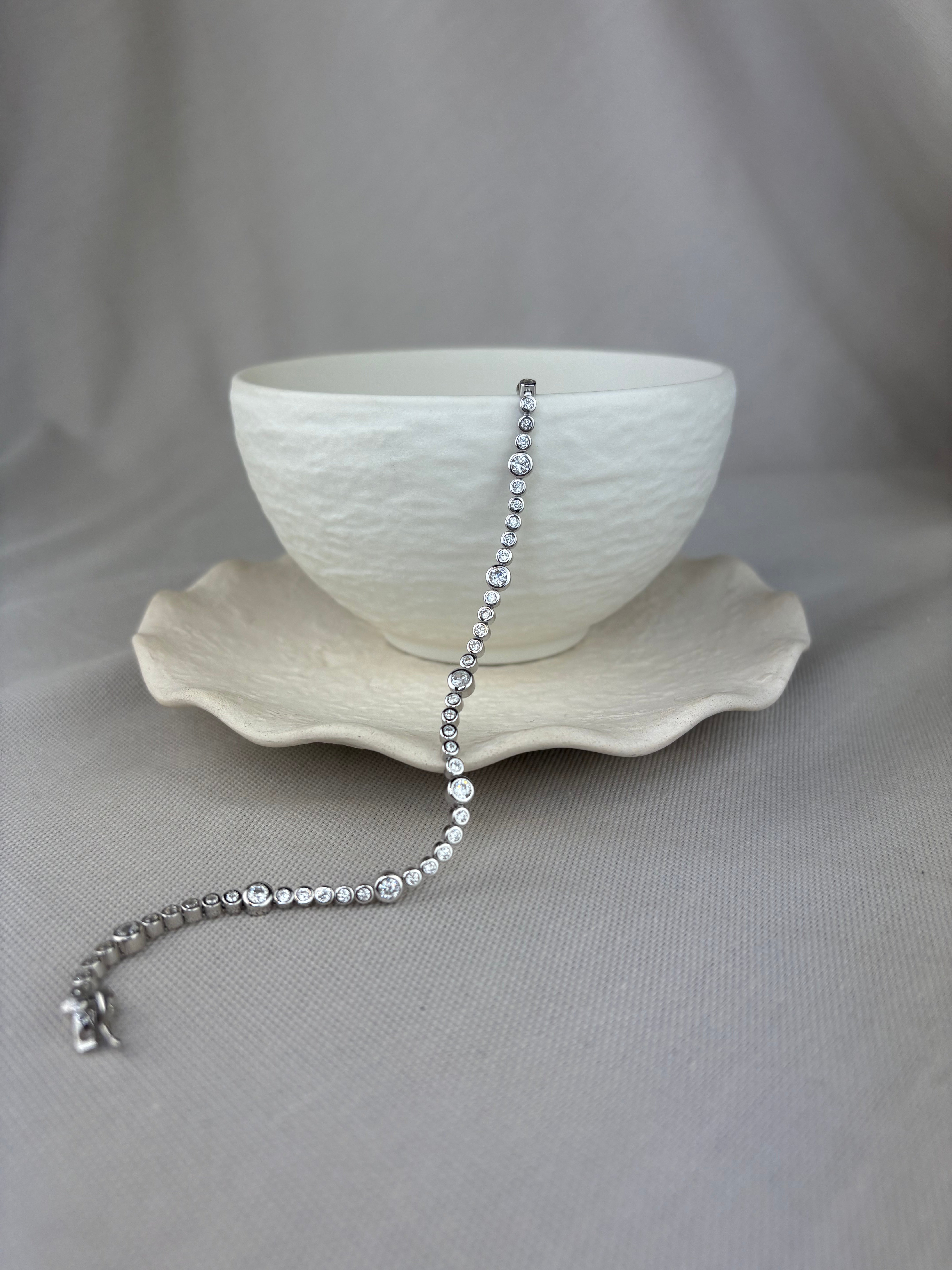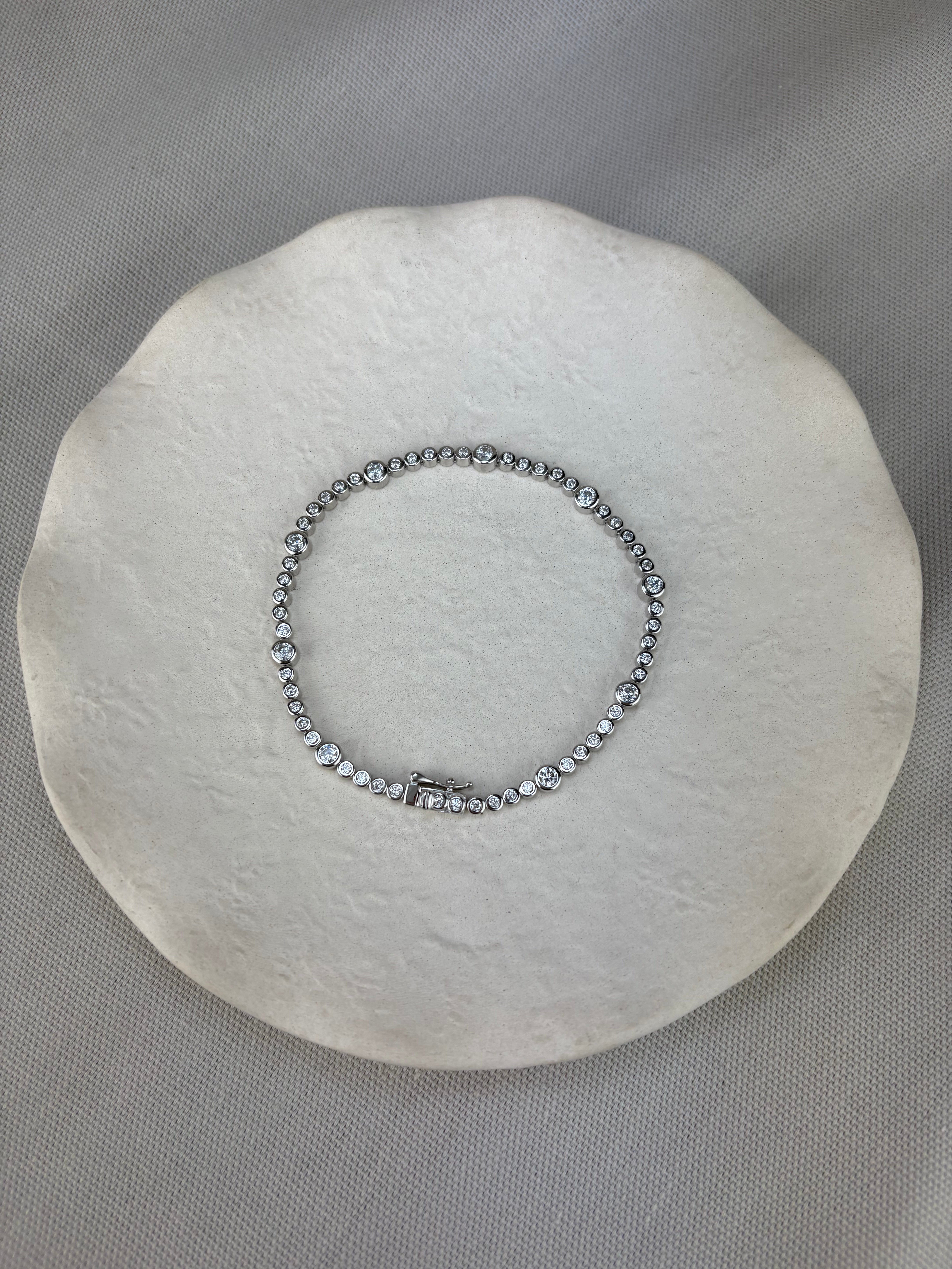 This round stone tennis bracelet is just a little different: as it features bezel set cubic zirconia stones of alternating sizes.