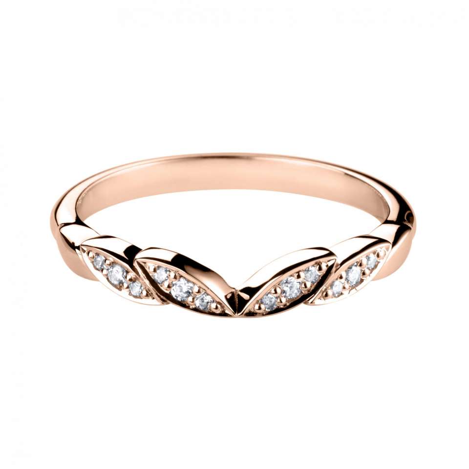 This example is a floral inspired diamond set shaped band with a V shape silhouette. Available in either 9ct or 18ct rose gold, you can also choose to have diamonds either G colour with VS clarity, or H colour with SI clarity.