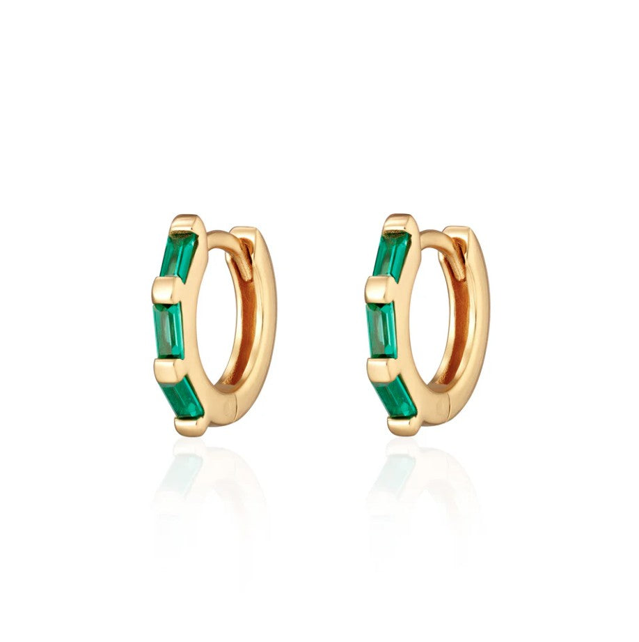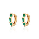 These emerald green baguette huggie hoop earrings offer a styling design and the best of the green stone jewellery trend.