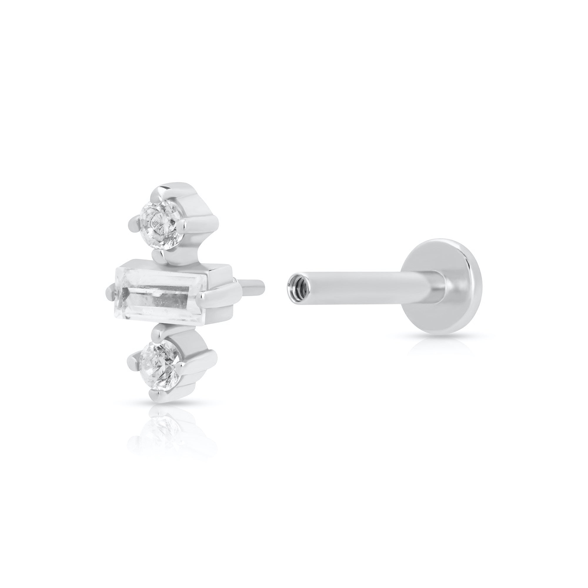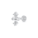 Sold singularly this labret stud is super comfortable and ideal for everyday styling, and adds subtle sparkle with two circular shaped cubic zirconia stones alongside a small baguette cut cubic zirconia.