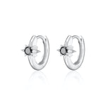 Drawing you in with it's jet black hues these star huggie hoop earrings feature a single faceted black cubic zirconia stone that sits towards the front of the ear.