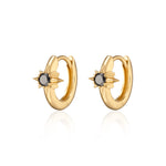 Drawing you in with it's jet black hues these star huggie hoop earrings feature a single faceted black cubic zirconia stone that sits towards the front of the ear.