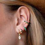 Each cabochon features alluring green patterns, showcasing the distinctiveness of this transformative stone. Add a touch of elegance to your earring collection with this exclusive pair of huggie hoops. As a symbol of good luck and positive energy, malachite's green hue will surely captivate you. Don't miss your chance to own these one-of-a-kind green stone huggie hoops and elevate your earring collection.