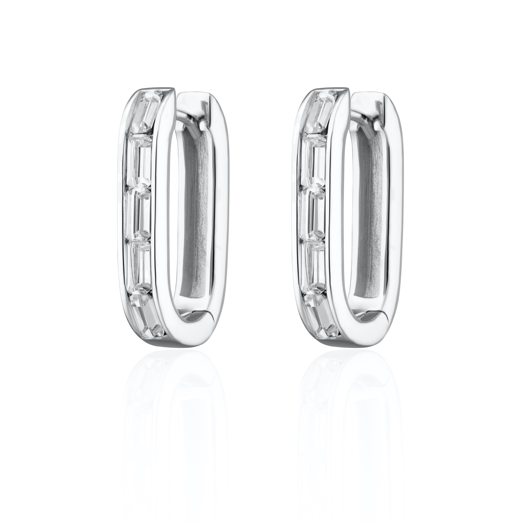 Thanks to the 5 inlaid baguette cut cubic zirconia stones these silver oval hoop earrings pop with clear sparkle! Featuring a secured hinged click to close clasp, these rectangular shaped hoops can be worn a multiple of ways. Perfect for upper or lower ear piercings you can also link the oval hoops together to create a longer earring design.