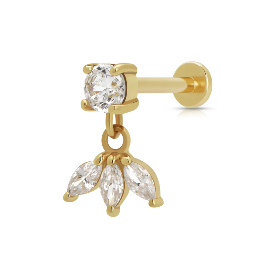 A refined take on classic sparkle, this princess flat back earring is designed to add delicate movement to curated ear looks. Featuring a round clear cubic zirconia stud with a suspended trio of marquise-cut stones, the design creates a soft drop effect that catches the light with every movement.