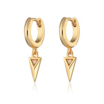 Crafted from rhodium plated sterling silver or 18ct gold plated silver, these charm hoop earrings feature a faceted triangular charm adorned with a clear cubic zirconia stone, hanging from a sleek hoop. With a rebellious twist on art deco vibes, these triangle charm hoop earrings add the perfect punch of attitude to your everyday style. Because why blend in when you can break the rules?