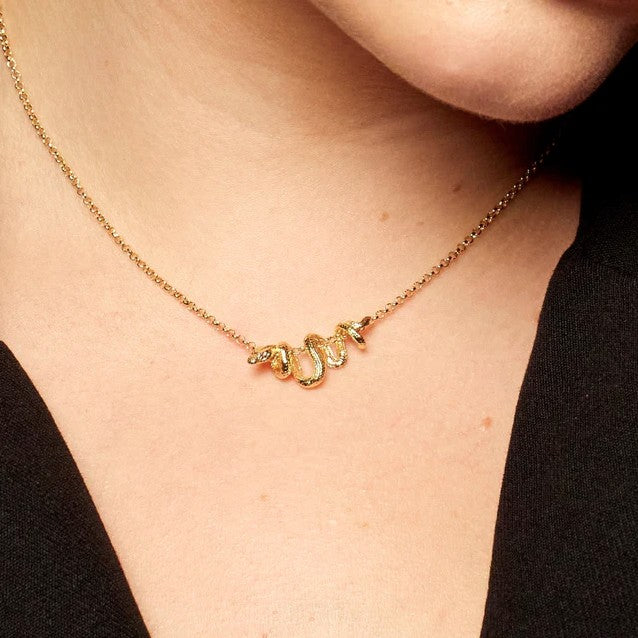 Featuring a stunningly detailed coiled snake charm that wraps around a fine belcher chain, crafted from sterling silver or 18ct gold plated silver. The snake is a popular motif in the jewellery world, and is used as a symbol of wisdom, elegance and mystery.