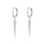 Available in rhodium or 18ct gold plated silver these drop hoop earrings feature a spiked charm studded with clear cubic zirconia stones suspended from a polished hoop allowing for subtle movement and a dazzling shine. A contemporary design it combines geometric shapes with a triangular spike and clear stones for added sparkle. The perfect on-trend addition to our charm hoop earring collection.