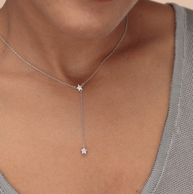 A super flattering Y-shape necklace design, studded with clear cubic zirconia stones shaped like stars. This necklace pairs perfectly with the Sparkling Star labret stud earrings.