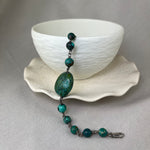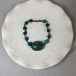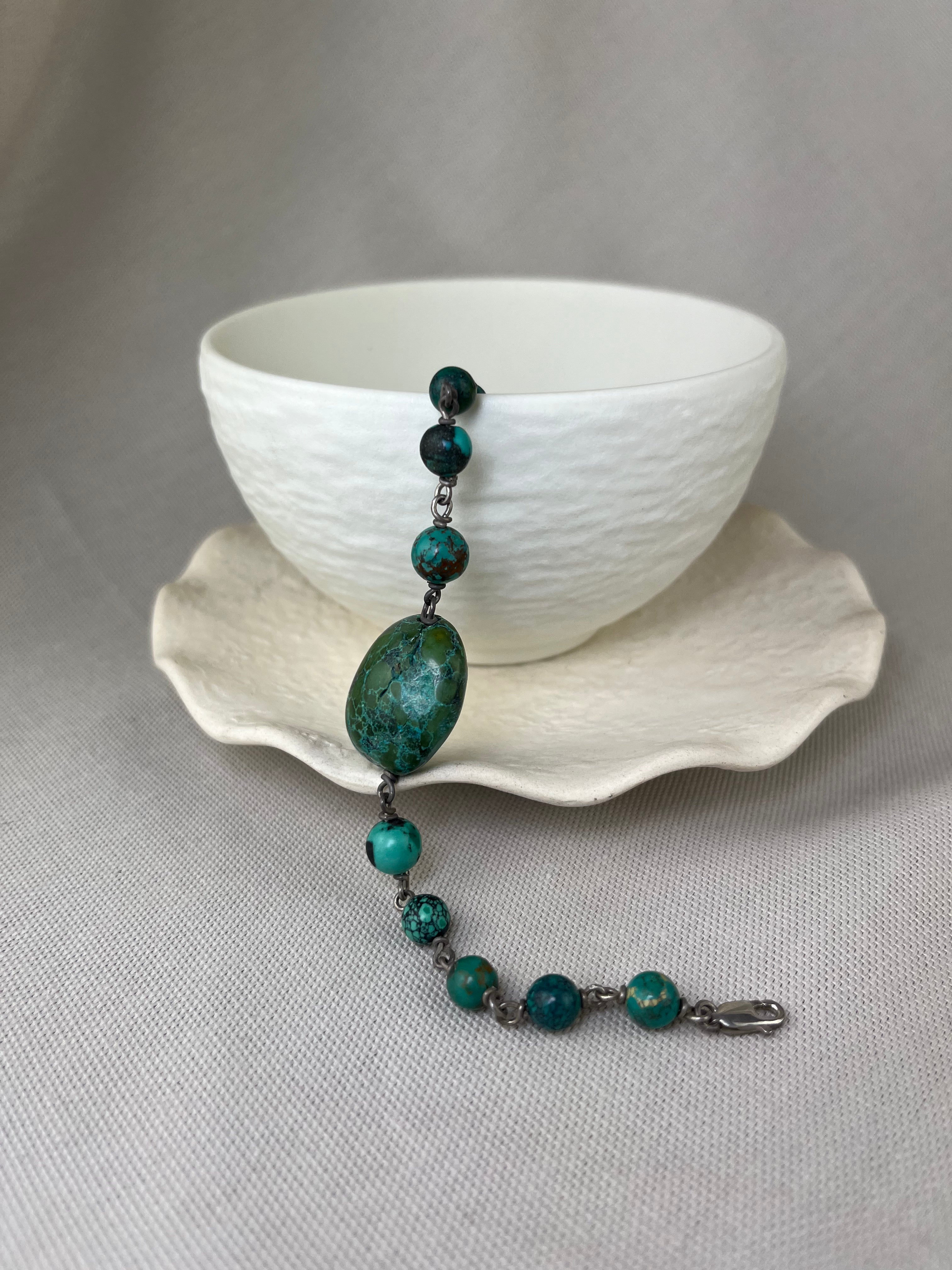This irregular design bracelet features a stream of round turquoise beads in shades of green and blue, displaying matrix as a design feature. The bracelet also showcases a substantial turquoise pebble as it's centrepiece.