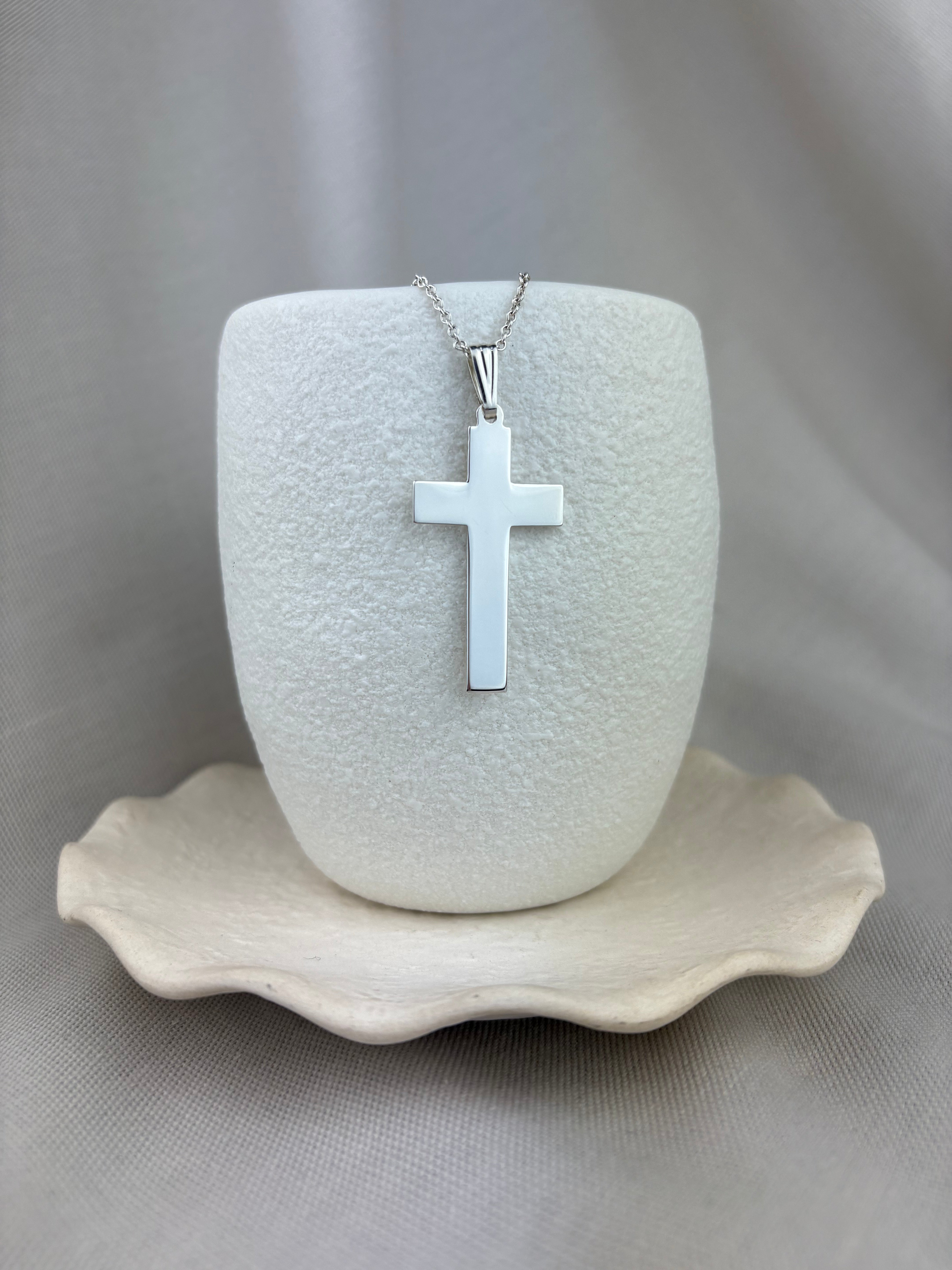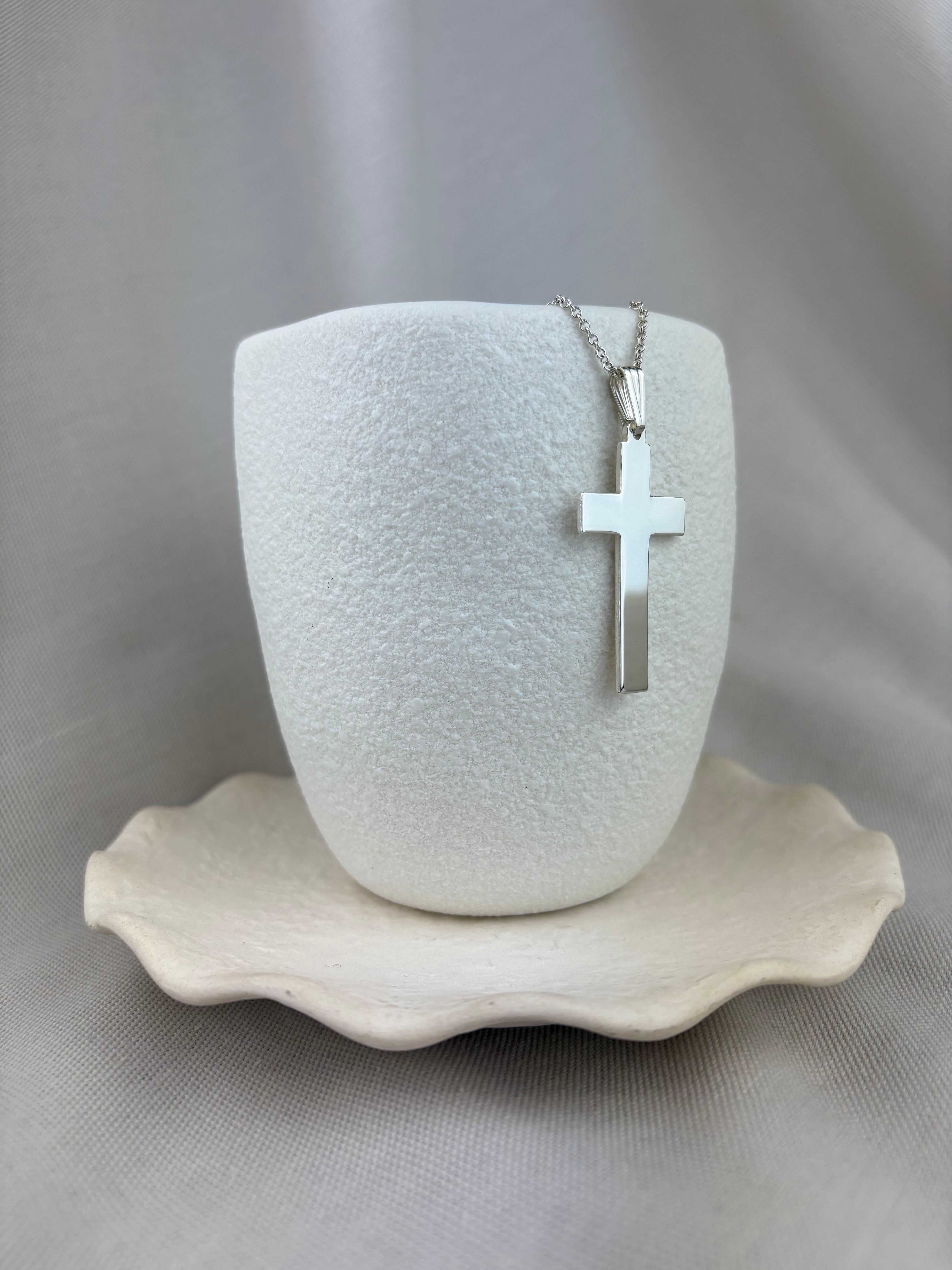This piece is made from sterling silver with a fluted tapered pendant loop. The cross can be purchased alone or with our recommended chain, however if you'd like a particular chain design or length please contact us for a quotation.