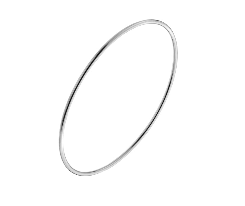 This simple round bangle is made from solid sterling silver round profile wire to create a clean, simple line when worn on the wrist.