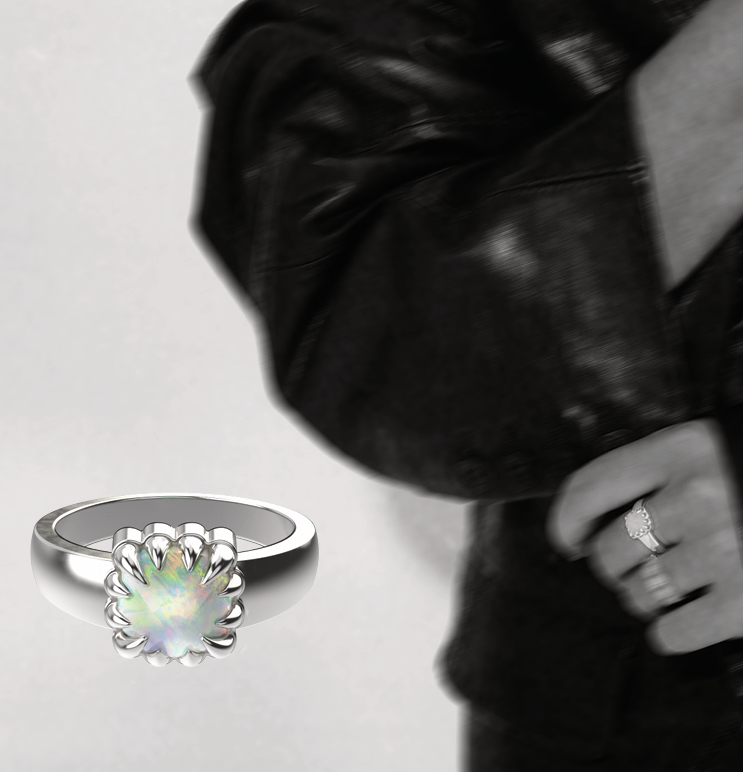 The Baby Claw ring is a mini take on SGC's iconic design— a statement solitaire ring, crafted in sterling silver and set with a luminous, faceted Bello Opal stone.