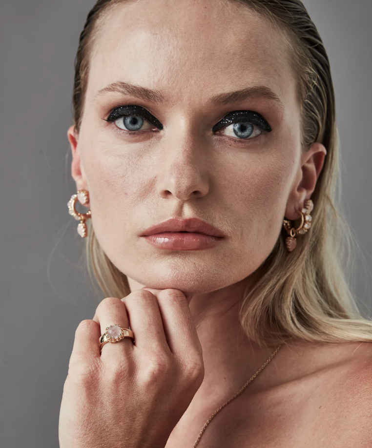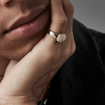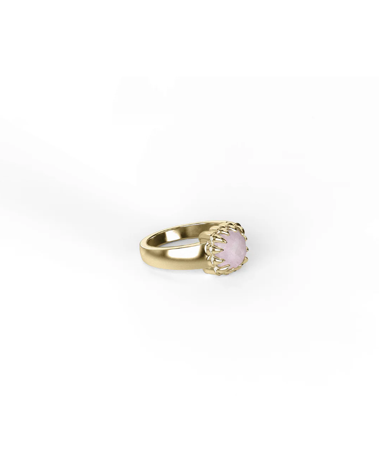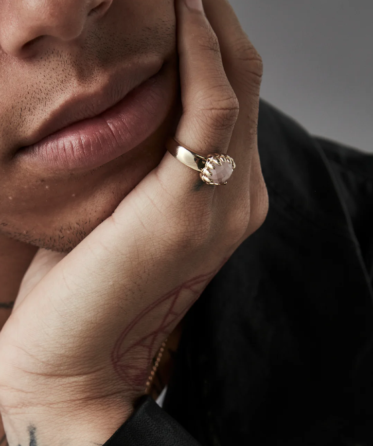 The Baby Claw Ring is designed to be your special statement piece. This tough-yet-beautiful ring is adorned with a large natural Rose Quartz stone, set in a wide 18ct Gold Plated band.