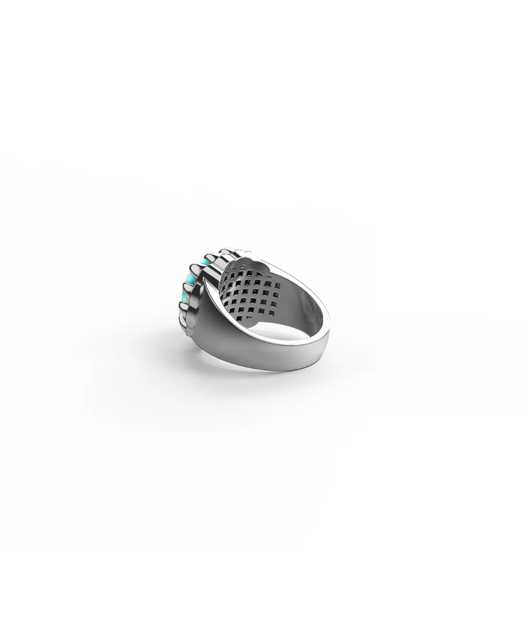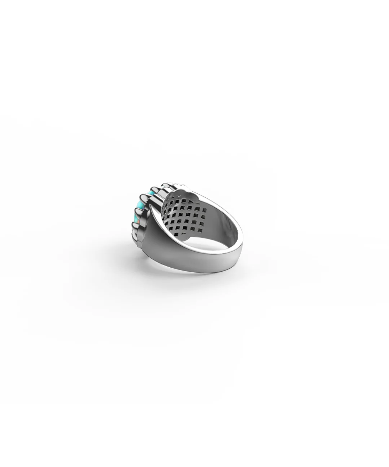 Crafted in high-polish sterling silver, it features a luminous Bello Opal that flashes green, blue, and purple with every movement.