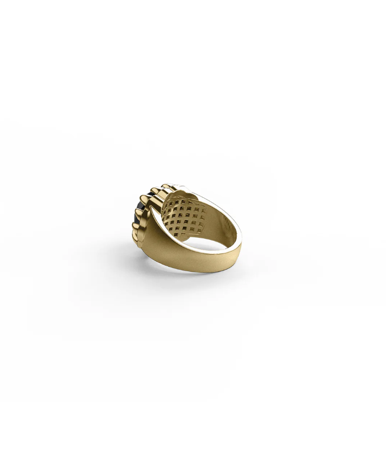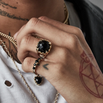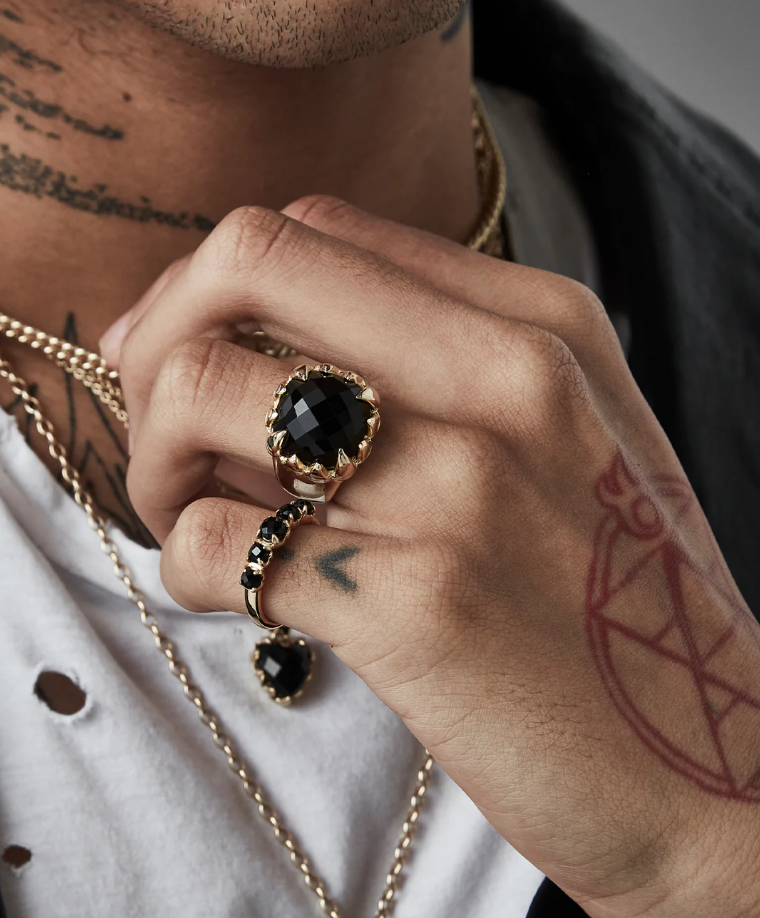The Claw Ring is designed to be your special statement piece. This tough-yet-beautiful ring is adorned with a large natural Onyx stone, set in a wide 18ct Gold Plated band.