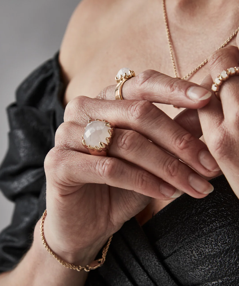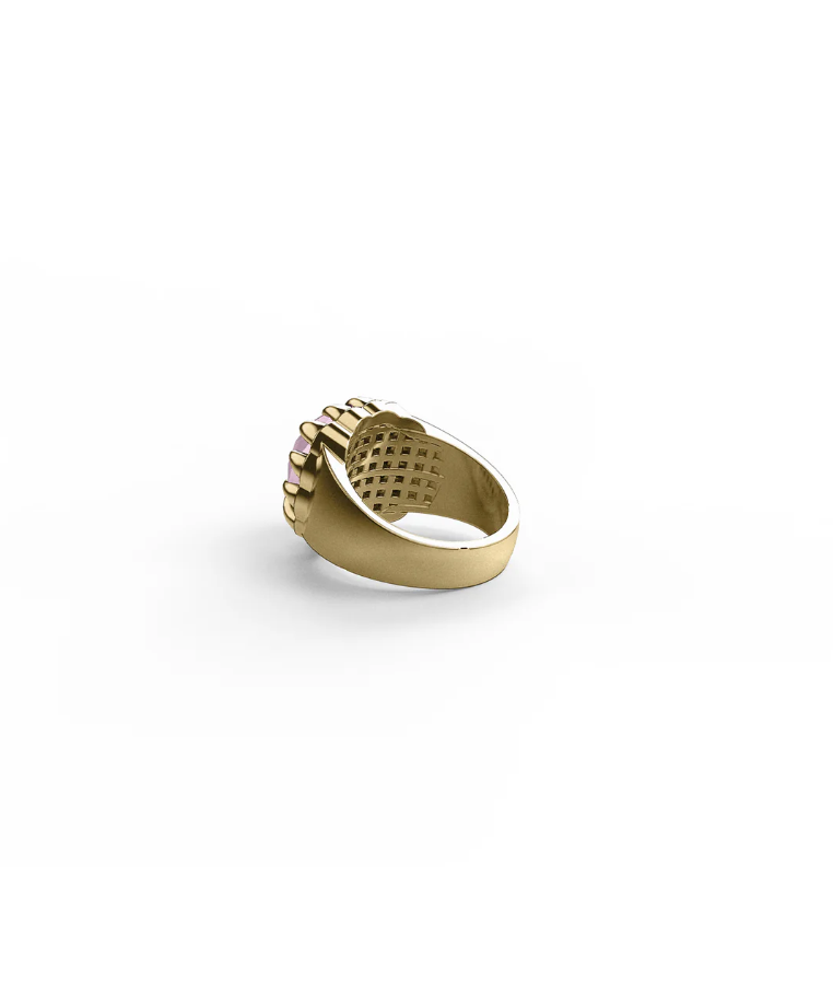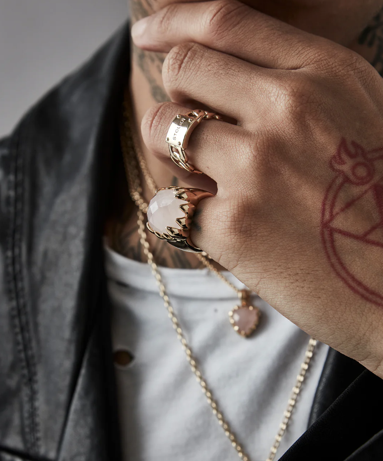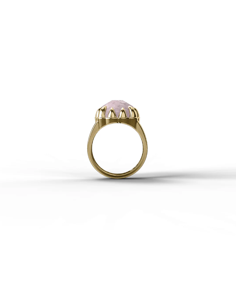 The Claw Ring is designed to be your special statement piece. This tough-yet-beautiful ring is adorned with a large natural Rose Quartz stone, set in a wide 18ct Gold Plated band.