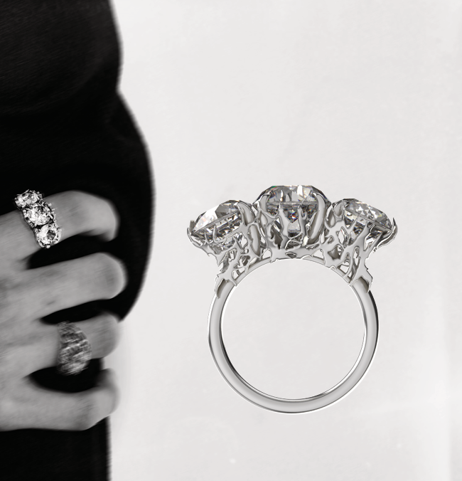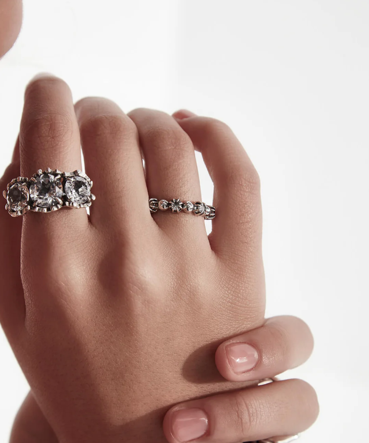 The Delicate Distortion Cocktail Ring features a crown of oversized faceted clear quartz stones — cut like estate heirlooms, but set in claw prongs that are anything but traditional.