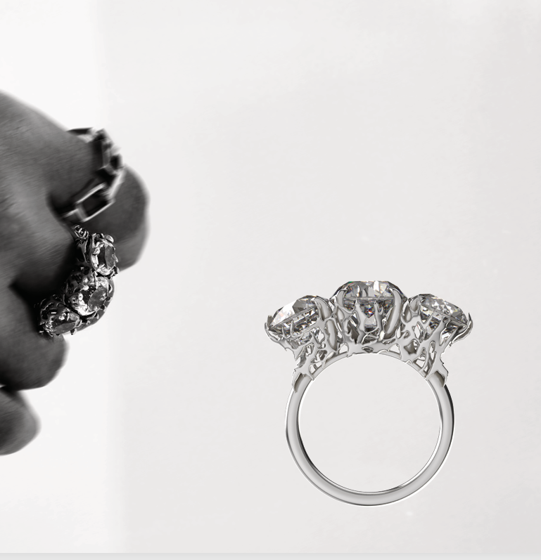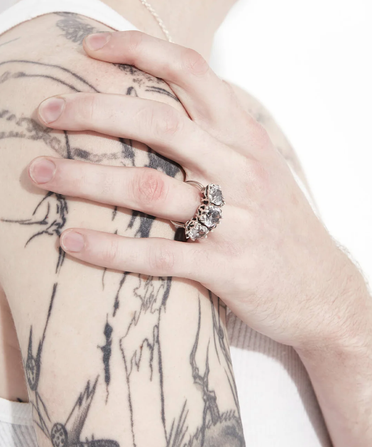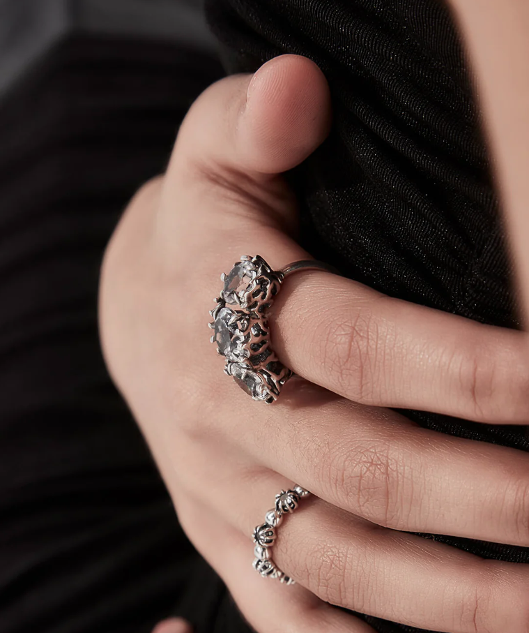 This duality — between the refinement of antique ceremony and the disruptive nature of subcultural language — defines the piece. Regal in presence, deliberate and architectural. A modern artifact that crowns the hand like armour.